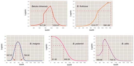 Response curves of temperature seasonal standard deviation (bio04) affecting the distribution of five Betula species. The range of logistic greater than 0.5 is shown in the figure.