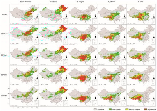 Potential suitable distributions map of five Betula species under the current climate and four future climate scenarios (SSP1-2.6, SSP2-4.5, SSP3-7.0, and SSP5-8.5). Suitability levels are represented by different colors: gray for unsuitable ranges, green for low suitability, yellow for medium suitability, and red for high suitability.