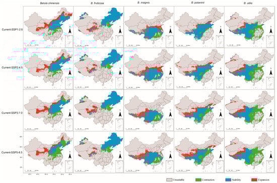 Distribution changes of five Betula species from the current climate to four future climate scenarios (SSP1-2.6, SSP2-4.5, SSP3-7.0, and SSP5-8.5). Gray represents unsuitable ranges, green indicates contraction ranges, blue represents stable ranges, and red indicates expansion ranges.