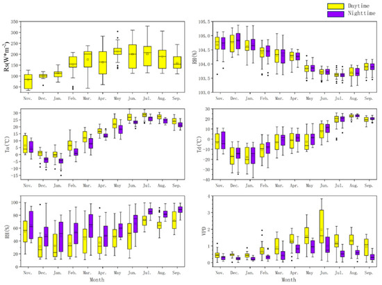 During the growing season, Rs, Ta, Td, and RH varied significantly from month to month, and all of them reached their highest levels in July. Due to high temperatures and humidity in July and August, the distribution of Ta and Td is more concentrated. At the same time, VPD reached its lowest value in July. During the non-growing season, there was little overall change in VPD and P. Ta, Td, and RH all showed a decrease followed by an increase, with January being the driest and coldest month.