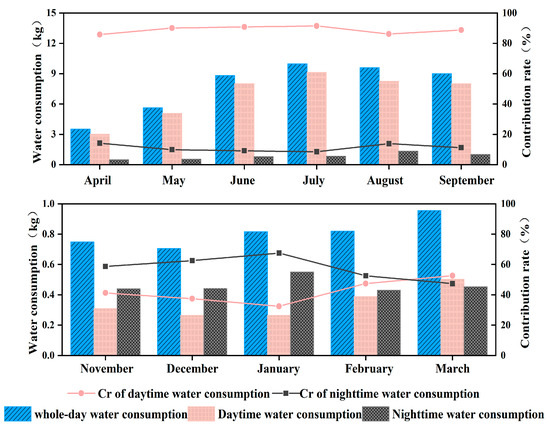In the non-growing season, the nighttime water consumption contributions were all at higher levels, with the highest being 67.56% in January. In January and before, the nighttime water consumption contribution was higher than the daytime. After that, the daytime water consumption contribution increased, with the highest contribution of 52.58% in March. The changes in the proportion of daytime water consumption and the proportion of sunshine time show similarities (the proportion of sunshine time from November to March is 42.1%, 39.6%, 40.8%, 44.6%, and 50.0%, respectively).