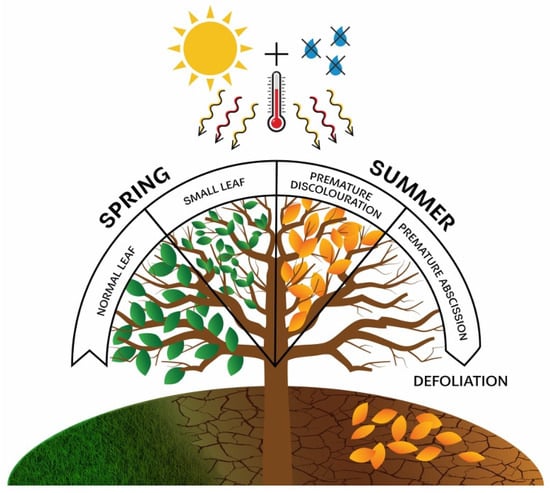 In our literature review, we found numerous studies addressing early warning signs of tree desiccation caused by drought [35,36,37]. However, we did not find a source that consolidates all early warning signs detectable solely through visual inspection of tree canopies. Therefore, in this review, we analyse the currently available literature and the acquired knowledge and personal observations gathered over 20 years of field research on early signs of tree desiccation that can be observed visually, providing answers on how trees respond under intense and prolonged drought conditions.