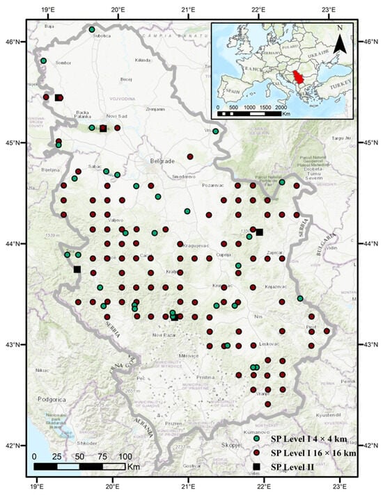 This study was conducted in Serbia (41°53′–46°11′ N, 18°49′–23°00′ E) on 130 permanent sample plots (Level I) arranged in a systematic transnational grid and 5 sample plots with intensive monitoring (Level II) following the ICP Forests Programme methodology [34] (Figure 2). In addition to the permanent sample plots, our observations were also based on forest areas in the immediate and broader vicinity of these plots. The most widespread deciduous tree species in Serbia is beech (Fagus sylvatica L.), followed by Turkey oak (Quercus cerris L.), sessile oak (Quercus petraea (Matt.) Liebl.), Hungarian oak (Quercus frainetto Ten.), hornbeam (Carpinus betulus L.), and others. Among conifers, Norway spruce (Picea abies (L) Karst.) is the most common species, followed by black pine (Pinus nigra Arn.), fir (Abies alba Mill.), and Scots pine (Pinus sylvestris L.) [27]. Most of Serbia belongs to a temperate climate zone, while the southwestern part lies at the border of the Mediterranean subtropical and continental climates [49]. According to the Köppen and Köppen–Geiger climate classification [50], two climate types are distinguished in Serbia: warm temperate and cold temperate [51]. The warm temperate climate dominates over 90% of the territory, except in areas at higher altitudes, where the cold temperate climate is present [51].