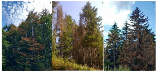 Some studies suggest that drought may have a lesser impact on smaller trees located beneath the canopies of larger ones [15,16], as well as due to specific characteristics of the species and its water requirements [17]. They also note that competition and species diversity do not always influence a particular species’ resistance to drought [18,19], meaning that mixed-species composition within the stand will not always reduce desiccation in drought-intolerant species [20]. However, regardless of whether a tree grows within a community, such as a forest, or as an individual in an open area, it encounters a range of favourable and adverse conditions for its growth and development throughout its life. Each tree individually competes for space and the prevailing conditions in its environment. When these conditions significantly deviate from the norm of its habitat, the tree struggles for survival and sends out early warning signals. These conditions are most often related to climatic factors, such as high temperatures accompanied by prolonged periods of precipitation deficit, i.e., drought. Additionally, seasonally variable plant physiology determines whether the resulting soil moisture deficit is physiologically detrimental [21]. Furthermore, living conditions may be altered by biotic factors, such as pest outbreaks (e.g., defoliators and bark beetles), which can affect large forest areas but are most often associated with a specific tree species, i.e., the host plant. Consequently, they can cause even greater damage in pure stands. Abiotic factors, including sudden weather events, can cause ice, snow and windbreaks, further creating favourable conditions for the pest and fungi population outbreak. Anthropogenic impacts, like mechanical damage from tree cutting or soil contamination from hazardous spills, can also contribute. However, the abovementioned impacts are typically localised and may occur over smaller or moderately large areas. Conversely, drought can affect and often covers extensive areas (with various tree species) that may extend beyond the borders of an area, country, or region. Indeed, some signals are visually indistinguishable, but these are not the focus of this study. We concentrate exclusively on visible signs in tree canopies observed in the field, which, when detected, can be further confirmed using advanced technologies such as remote sensing over broader areas [22].