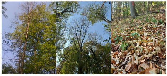 Examples of premature leaf abscission/shedding caused by drought during the vegetative period. Fagus sylvatica L.: (A) (August 2013), (B) (beginning of September 2024), (C) (beginning of September 2024).