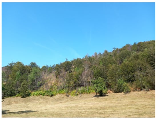 As we have already noted, we must be aware of the phenological phases of trees to better understand the concept of premature abscission of leaves. Knowing the usual time for leaf abscission, and if it begins to be noticed during the vegetation period, it is a clear sign of environmental disturbance. The signal that indicates this fact is the dried leaves that can be observed on the branches, especially for species this is not typical, such as beech (Figure 5), unlike some oaks, which can retain their dried leaves on their branches long after their desiccation. Additionally, as we have already mentioned, premature leaf abscission must be considered beyond the concept of defoliation since it intensely manifests due to the impact of some stressful event and at an unusual time for this occurrence. Experts dealing with this topic note that one year of early leaf abscission due to drought will have minimal impact on most tree species, but if there are several consecutive years, it can be very stressful [91]. As with leaf discolouration, if signs of premature leaf abscission occur over a wider area, it will be a clear indicator of drought impact (Figure 8).