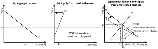 When the harvesting restriction is imposed, the supply from the restricted market is withdrawn . Consequently, the residual demand merges with the aggregate demand , indicating that the aggregate demand needs to be satisfied solely by the supply from the unrestricted markets.