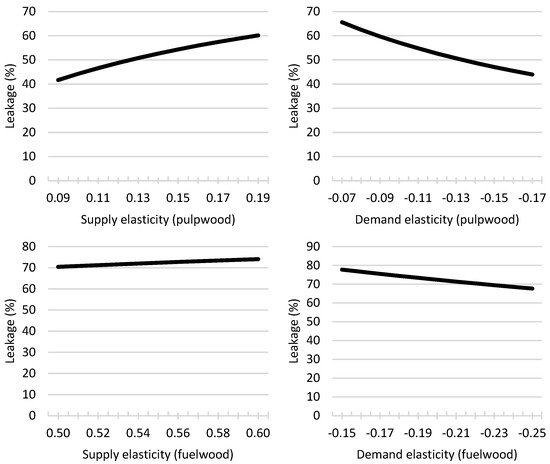 It is expected that the leakage will increase with the supply elasticity and decrease with the demand elasticity . Figure 2 illustrates the change in leakage with the variation in the elasticities. As expected, the leakage increases with the supply elasticities and decreases with the demand elasticities. Variations in the demand and supply elasticities of pulpwood have the largest impact on the leakage. Also, variations in the supply elasticity of timber result in relatively large changes in the leakage. Variations in the other elasticities result in smaller changes in leakage. Limited responsiveness to smaller changes in the timber supply and demand elasticities is also found by ref. [33]. Therefore, the validity and accuracy of this study’s results are strengthened.