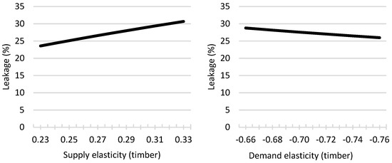 It is expected that the leakage will increase with the supply elasticity and decrease with the demand elasticity . Figure 2 illustrates the change in leakage with the variation in the elasticities. As expected, the leakage increases with the supply elasticities and decreases with the demand elasticities. Variations in the demand and supply elasticities of pulpwood have the largest impact on the leakage. Also, variations in the supply elasticity of timber result in relatively large changes in the leakage. Variations in the other elasticities result in smaller changes in leakage. Limited responsiveness to smaller changes in the timber supply and demand elasticities is also found by ref. [33]. Therefore, the validity and accuracy of this study’s results are strengthened.