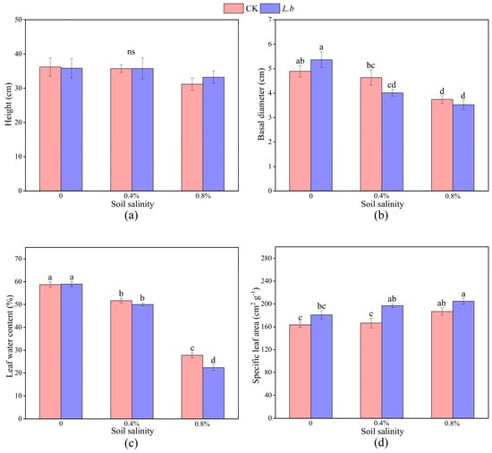 (a) hight, (b) basal diameter, (c) leaf water content and (d) specific leaf area of Q. dentata seedlings in the control (CK) and inoculation (L.b) groups subjected to different NaCl treatment concentrations. Bars represent means of six replicates (±SE). For each parameter, bars with different letters indicate significant differences among treatments (p ≤ 0.05) determined by one-way analysis of variance (ANOVA).