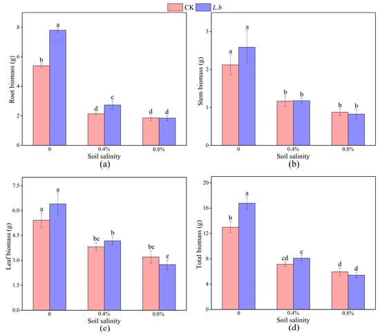 (a) root biomass, (b) stem biomass, (c) leaf biomass and (d) total biomass of Q. dentata seedlings in the control (CK) and inoculation (L.b) groups subjected to different NaCl treatment concentrations. Bars represent means of six replicates (±SE). For each parameter, bars with different letters indicate significant differences among treatments (p ≤ 0.05) determined by one-way ANOVA.