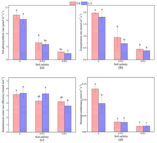 Gas exchange parameters of Q. dentata seedlings in the control (CK) and inoculation (L.b) groups subjected to different NaCl treatment concentrations: (a) net photosynthetic rate, (b) transpiration rate, (c) instantaneous water use efficiency, (d) stomatal conductance. Bars represent means of five replicates (±SE). For each parameter, bars with different letters indicate significant differences among treatments (p ≤ 0.05) determined by one-way ANOVA.