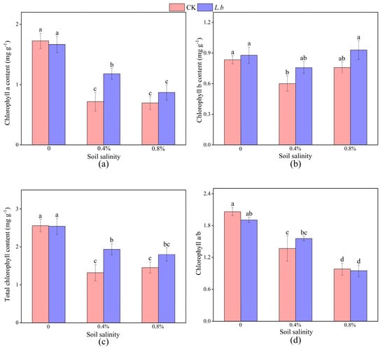 Leaf chlorophyll content of Q. dentata seedlings in the control (CK) and inoculation (L.b) groups subjected to different NaCl treatment concentrations: (a) chlorophyll a content, (b) chlorophyll b content, (c) total chlorophyll content, (d) chlorophyll a/b. Bars represent means of five replicates (±SE). For each parameter, bars with different letters indicate significant differences among treatments (p ≤ 0.05) determined by one-way ANOVA.