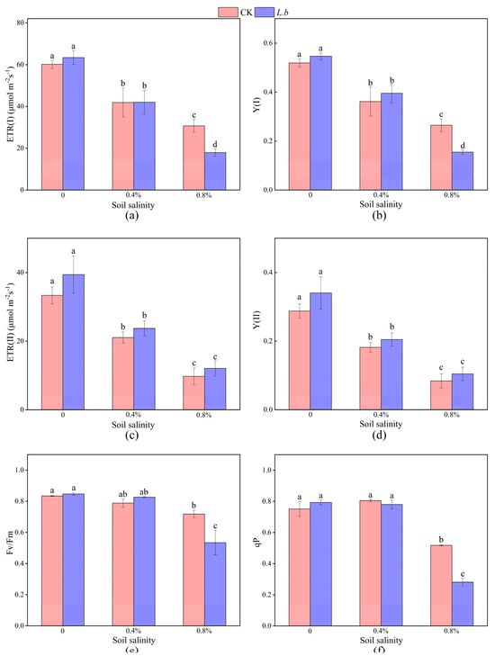 Chlorophyll fluorescence parameters of Q. dentata seedlings in the control (CK) and inoculation (L.b) groups subjected to different NaCl treatment concentrations: (a) ETR(I), (b) Y(I), (c) ETR(II), (d) Y(II), (e) Fv/Fm and (f) qP. Bars represent means of five replicates (±SE). For each parameter, bars with different letters indicate significant differences among treatments (p ≤ 0.05) determined by one-way ANOVA.