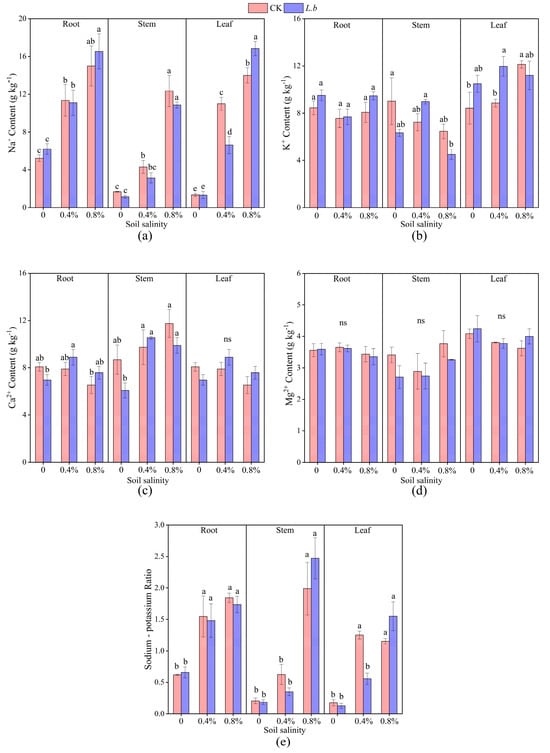 Metal ion content and ratio of Q. dentata seedlings in the control (CK) and inoculation (L.b) groups subjected to different NaCl treatment concentrations: (a) Na+ content, (b) K+ content, (c) Ca2+ content, (d) Mg2+ content and (e) sodium-potassium ratio. Bars represent means of five replicates (±SE). For each parameter, bars with different letters indicate significant differences among treatments (p ≤ 0.05) determined by one-way ANOVA.