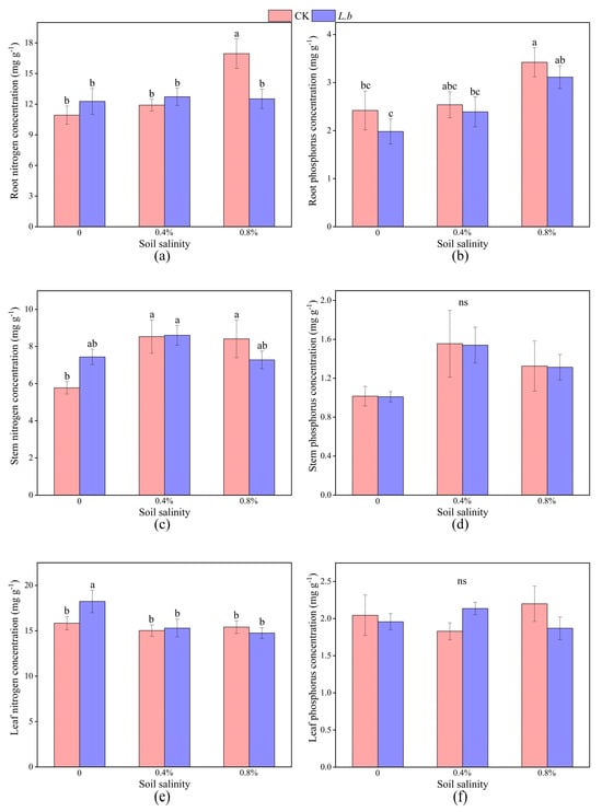 Nutrient concentration of Q. dentata seedlings in the control (CK) and inoculation (L.b) groups subjected to different NaCl treatment concentrations: (a) root nitrogen content, (b) root phosphorus content, (c) stem nitrogen content, (d) stem phosphorus content, (e) leaf nitrogen content and (f) leaf phosphorus content. Bars represent means of five replicates (±SE). For each parameter, bars with different letters indicate significant differences among treatments (p ≤ 0.05) determined by one-way ANOVA.