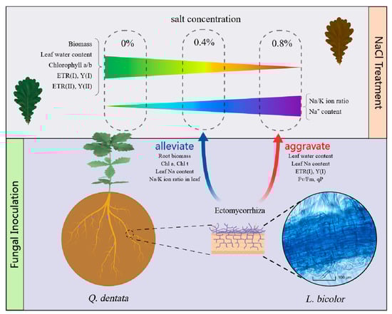 Symbiotic relationships between mycorrhizal fungi and host plants are not unbreakable [63], and cooperation becomes uneven when resource exchange is diminished or stops in response to environmental stress [64,65]. As soil salinity gradually exceeds the normal tolerance range of plants, the relationship between symbiotic mycorrhiza and the host plant becomes more subtle [66,67]. The effects of EMF inoculation on various indicators, like tissue biomass, gas exchange parameters, chlorophyll content, chlorophyll fluorescence parameters, and sodium–potassium ratio, were weaker under high salt stress. Regardless, the mycorrhizal association did not provide any benefit to the host plants when the seedlings were unable to withstand the damage caused by salt stress (Figure 9). At the same time, we found that moderate NaCl promotes the growth of L. bicolor mycelium (Table A2), consistent with previous research demonstrating the salt tolerance of the L. bicolor [68]. As salinity increases, the ability of the fungus to generate its own growth as well as its vigor to colonize and live in symbiosis with the host plant decreases; in particular, mycorrhizal colonization rates are significantly lower under high salt conditions than they are under no-salt and medium-salt conditions (Table 1). The high salinity environment could raise the threshold of fungal competitiveness to the host plants; L. bicolor that colonize Q. dentata seedlings not only become less numerous but play a negative role in plant growth.