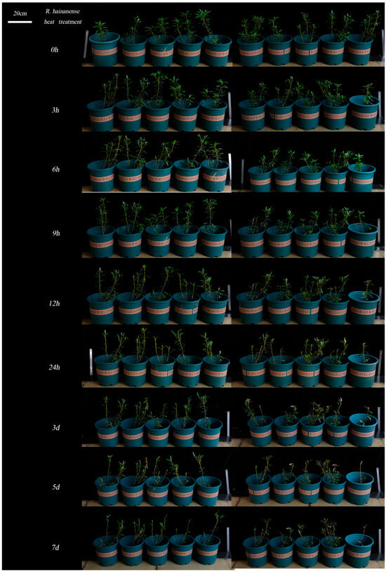 The materials used in this experiment, R. hainanense, were sourced from the agricultural science base of Hainan University (Haikou, China) (20.057 N, 110.323 E, 6 m above sea level), and three-year-old R. hainanense samples with consistent growth were selected. The plant is in the late growth period, the rhizome becomes thicker, and the root system is intact. The samples were cultured in an artificial climate chamber (25 °C/22 °C, 14 h/10 h, 2000 μmol m−2 s−1, 75% Rh) for 30 days to ensure the same initial state. Subsequently, high-temperature treatment (40 °C/32 °C, 14 h/10 h, 2000 lx, 75% Rh) was conducted for 7 days. We collected 3–5 rounds of leaf samples from the apex at time points of 0 h, 3 h, 6 h, 9 h, 12 h, 24 h, 3 d, 5 d, and 7 d, with three replicates each, and each replicate from ten plant lines (Figure 1). The leaves were frozen in liquid nitrogen and stored at −80 °C for subsequent experiments. To systematically gain a preliminary understanding of the heat tolerance of R. hainanense, we compared it with the closely related species Rhododendron dauricum (L.) Planch to evaluate the heat tolerance of R. hainanense. R. dauricum is a plant in the Ericaceae family, and it is mentioned in the literature that R. dauricum and R. hainanense belong to the same genus, showing a close evolutionary relationship [26]. It is currently widely used in landscape gardening. Comparisons between Rhododendron species reveal that R. dauricum has excellent heat tolerance [27], making it a suitable control material for studying the heat tolerance of R. hainanense. The growth and treatment indices of R. dauricum were consistent with those of R. hainanense.