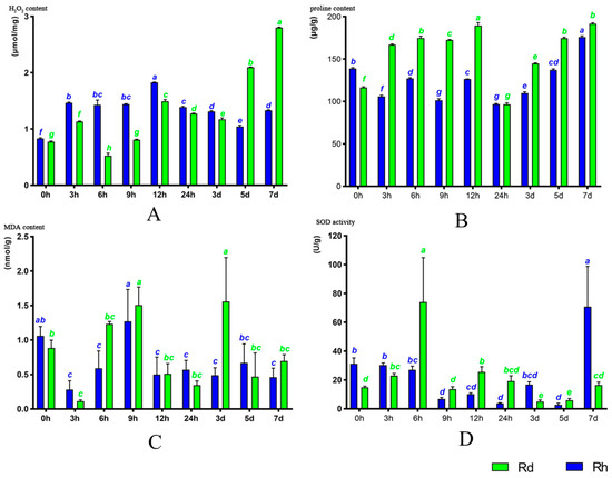 Physiological indicators of R. hainanense and R. dauricum under high temperature stress over time. Comparison of Hydrogen peroxide content (A), proline content (B), MDA content (C) and SOD activity (D) of R. hainanense and R. dauricum under 40 °C high temperature. Note: Duncan’s teat (SSR), different small letter in the figure mean signficant difference (p < 0.05).