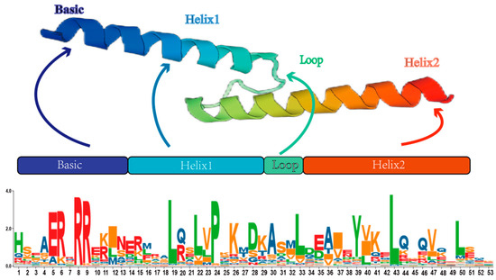 The upper part of the figure shows the 3D protein modeling of the bHLH characteristic structure of the RhbHLH gene, with blue, cyan, green, and red representing the basic, helix1, loop, and helix2 structures, respectively. The lower part of the figure illustrates the conservation of the characteristic sequences, where the more conserved the amino acid at the site, the higher the representation of the amino acid letter.