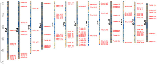 After annotating the gff file of R. hainanense., we found that 112 RhbHLH genes are unevenly distributed across 13 chromosomes (Figure 4). Five genes with unconfirmed locations were named RhbHLH112–RhbHLH117. Chromosome 12 has the most bHLH genes (16), followed by chromosome 7 (13) and chromosome 6 (11), while the bHLH genes in chromosome 3 are the fewest (4). This suggests that the chromosomes with the majority of RhbHLH genes are more likely to be related to plant growth and stress processes.