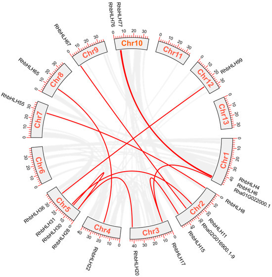 RhbHLH segmental duplication. Trajectories represent the collinear relationships of the whole genome of R. hainanense, with the outer area being coded gray blocks based on chromosome length. The gray lines represent duplicated collinear genes in R. hainanense, while the red lines represent duplicated collinear genes of the bHLH gene family. When the lines move away from the center, it indicates that the CG ratio contained in that gene is higher. Collinear bHLH genes are annotated in the figure.