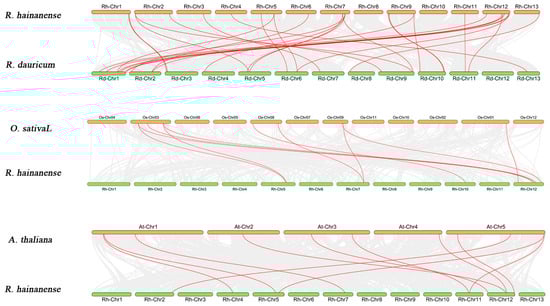 Collinearity analysis R. hainanense bHLH gene between O. sativaL, A. thalianas, and R. dauricum. The analysis is listed from top to bottom for O. sativa and R. hainanense, A. thalianas and R. hainanense, R. dauricum and R. hainanense. The chromosomes of R. hainanense are represented by green blocks, while the chromosomes of other comparative species are represented by orange blocks. The gray lines indicate collinear segments between the two species, while collinear NAM gene pairs are connected by red lines.