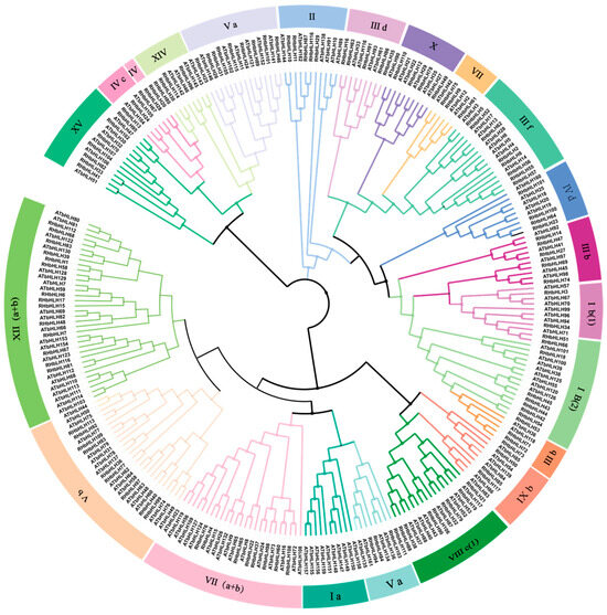 In order to study the bHLH gene family’s evolutionary degree, using the subfamily classification of the bHLH gene family in A. thalianas as a reference [42], sequences with close relationships and similar functions were classified into the same subfamily. The phylogenetic tree was generated using the maximum likelihood (ML) method of MEGA software (Version 10.0) (Figure 7). The phylogenetic tree includes the A. thalianas bHLH lineages (155) and the bHLH lineages we screened from R. hainanense (117). Using the subfamily classification of AtbHLH as a reference, the RhbHLH was divided into 21 subfamilies, among which subfamily XII has the highest number of members with a total of 23 genes, while subfamily Va has the least number of members with only 2 genes. The ratios of RhbHLH to AtbHLH subfamilies are somewhat similar, but there are significant differences in the ratios of certain subfamilies, indicating that the bHLH gene has a clear species preference and that there are differences between the two subfamilies [43]. Specific gene duplication events may have occurred during the evolution of R. hainanense, activating certain functional types of genes.