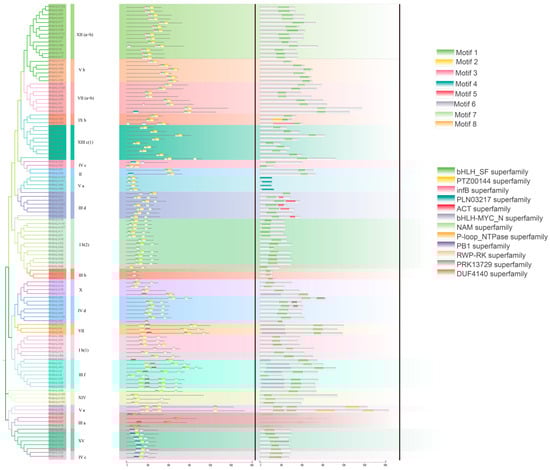 Analysis of the conserved motifs and phylogenetic relationships of the RhbHLH family was conducted using the MEME website (Figure 8). The results indicated that the generated eight conserved motifs ranged from motif 1 to motif 8, with motifs 1/2 widely distributed among all bHLH proteins, forming the bHLH domain. Other motifs were located in certain family members, and members with similar motifs were classified into the same subclass. For example, subclass XII (a + b) is composed of motifs 1/2/5, subclass IIIf is composed of motifs 1/2/5/8, and subclass Ib (2) is composed of motifs 1/2/7. At the same time, we used the NCBI-CDD online website to identify the protein domains of the RhbHLH family; with the exception of subclasses IIIa and Va, all genes contain the bHLH superfamily domain. Motifs within the same subclass have similar characteristics, but there are significant differences between subclasses.