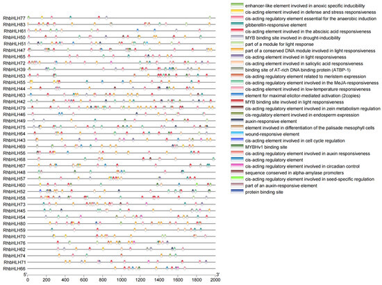 Cis-regulatory elements in organisms regulate gene expression by providing binding sites for interaction with other proteins [44]. Therefore, different binding sites interact with proteins of varying functions, determining the function of the cis-regulatory element [45]. The promoter regions were screened, and the parts related to plant growth and stress were retained. A total of 794 CREs (cis-regulatory elements) were detected in the RhbHLH promoter region. Approximately 31 CREs were effectively expressed. We selected the most representative elements for display, broadly classified into three functional groups: light response elements: part of a conserved DNA module involved in light responsiveness, cis-acting element involved in light responsiveness and part of a module for light response; hormone regulatory element: cis-acting regulatory element involved in the MeJA (Methyl jasmonate)-responsiveness, cis-acting element involved in the ABA (abscisic acid) responsiveness, cis-acting element involved in SA (salicylic acid) responsiveness; and stress response elements: cis-acting regulatory element essential for the anaerobic induction, cis-acting element involved in low-temperature responsiveness (LTR), MYB binding site (MBS) involved in drought-inducibility. The cis-acting regulatory element involved in the MeJA-responsiveness appeared 132 times (16.64%) and was found in 21 members. The cis-acting element involved in the abscisic acid responsiveness appeared 130 times (16.39%) and was found in 35 members. The cis-acting element involved in salicylic acid responsiveness appeared 30 times (3.78%) and was found in 22 members. MeJA and ABA are important hormones in plants, which play an important role in the process of plant stress and maturation [46]. The results suggested that Methyl jasmonate and abscisic acid were involved in the regulation of growth and development in R. hainanense by the RhbHLH family (Figure 9). Among them, a large number of light response elements (part of a conserved DNA module involved in light responsiveness and part of a module for light response) were found in the promoter regions of the bHLH family, suggesting that this bHLH family is significantly involved in plant diurnal rhythm and physiological tissue development. Low-temperature responsiveness (LTR) appeared 35 (4.03%) times, and the MYB binding site involved in drought-inducibility appeared 32 (3.78%) times. The results indicated that the RhbHLH family was also involved in the stress response process of R. hainanense. Detailed data can be found in Supplementary File S4.