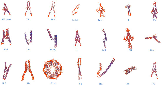 The function of proteins depends on their three-dimensional structure, so different structures produce different functions [47]. This study utilized the SWISS-MODEL database to predict the bHLH protein structures, taking as representatives the protein structures with the highest GMQE and MEAND scores (Figure 10). The results indicate that the protein structures of different subfamilies differ, with closely related subfamilies having similar structures, and their biological functions are also relatively similar. For example, group Va and group VII exhibit strong central symmetry. Subfamily III and subfamily X show central symmetry. The three-dimensional modeling of proteins and the prediction of protein structures among different subfamilies provide a preliminary basis for exploring their functions.