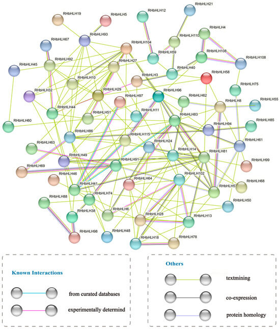 bHLH protein forms homodimers, binds to DNA, and plays roles in various processes in plants [6]. To understand the function of the RhbHLH protein more clearly, we used homologous genes of A. thalianas and predicted the interaction network of the tR. hainanense bHLH protein (Figure 11). This network has a total of 70 nodes and interactions. Moreover, most bHLH proteins can interact with other proteins. Due to the specificity of the bHLH protein structure, they often need to form dimers to complete their biological functions, and the interactions between proteins are close, with some interactions between proteins already experimentally confirmed in databases.