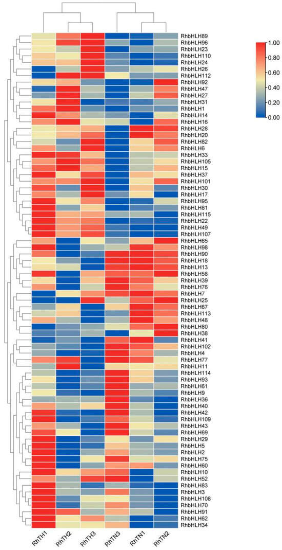 We collected the fpkm values of 117 RhbHLH in the transcriptome under high-temperature treatment and created a heat map (Figure 12) using TBtools software. The results showed that among the 117 bHLH sequences, five RhbHLH exhibited high expression levels after high-temperature treatment (RhbHLH107, RhbHLH49, RhbHLH62, RhbHLH89, RhbHLH41), while five RhbHLH showed significantly downregulated expression levels after heat treatment (RhbHLH41, RhbHLH67, RhbHLH4, RhbHLH102, RhbHLH18).