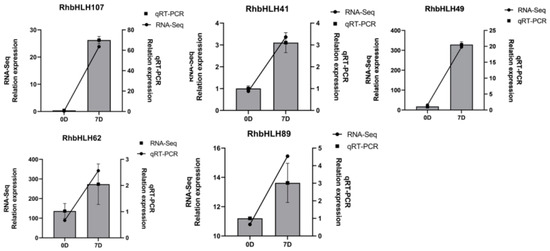 To verify the accuracy of the RNA-seq for bHLH genes, we selected five upregulated RhbHLH genes for qPCR, and the results showed that the expression trends were consistent with those of RNA-seq, proving the data’s accuracy (Figure 13).