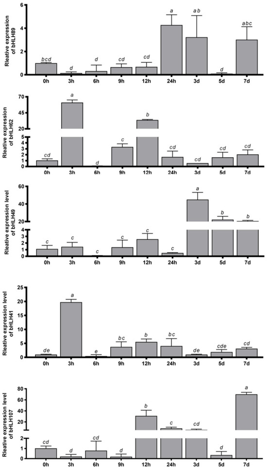 The results indicate that RhbHLH41 and RhbHLH62 expression significantly increased at the 3rd h after 40 °C treatment, sharply decreased again at the 6th h, and then gradually increased and stabilized. RhbHLH89, RhbHLH49, and RhbHLH107 showed no significant changes at the beginning of heat stress, until the gene expression started to increase at the 12th h, with RhbHLH89 reaching its highest expression at 24 h, which is 4.27 times that of the control group (NT), while RhbHLH49 and RhbHLH107 peaked at 38.77 times and 69.93 times, respectively, compared to the control group (NT) at 3 d and 7 d (Figure 14). The initial hypothesis was that they may play different roles in heat tolerance response, hence the different timing of their high expression, a hypothesis supported by the fact that RhbHLH107 and RhbHLH49 also have similar motif compositions.