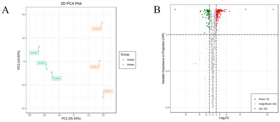 For this project, 6 samples of R. hainanensis were selected and divided into 2 groups according to the heat treatment time: RhTN group (normal temperature group, heat treatment day 0) and RhTH group (high temperature group, heat treatment day 7), with a total of 3 biological replicates in each group (RhTN1, RhTN2, RhTN3 and RhTH1, RhTH2, RhTH3). A total of 783 metabolites were detected based on the UPLC-MS/MS detection platform and a self-built database. The data acquisition instrument system mainly includes Ultra Performance Liquid Chromatography (UPLC) (SHIMADZU Nexera X2, https://www.shimadzu.com.cn/, accessed on 6 April 2021) and Tandem mass spectrometry (MS/MS) (Applied Biosystems 6500 QTRAP, https://sciex.com.cn/applications/life-science-research/proteomics, accessed on 6 April 2021). The liquid phase conditions mainly include (1) Chromatographic column: Agilent SB-C18 1.8 µm, 2.1 mm × 100 mm; (2) Mobile phase: Phase A is ultra-pure water (with 0.1% formic acid), Phase B is acetonitrile (with 0.1% formic acid); (3) Elution gradient: At 0.00 min, the proportion of Phase B is 5%, increasing linearly to 95% within 9.00 min, maintaining at 95% for 1 min, then from 10.00–11.10 min, the proportion of Phase B drops to 5% and is balanced at 5% until 14 min; (4) Flow rate is 0.35 mL/min; column temperature is 40 °C; injection volume is 2 μL. The mass spectrometry conditions mainly include LIT and triple quadrupole (QQQ) scanning is obtained on a triple quadrupole linear ion trap mass spectrometer (Q TRAP), AB6500 Q TRAP UPLC/MS/MS system, which is equipped with ESI Turbo ion spray interface, controlled by Analyst 1.6.3 software (AB Sciex) in both positive and negative ion modes. The ESI source operational parameters are as follows: ion source, turbo spray; source temperature 550 °C; ion spray voltage (IS) 5500 V (positive ion mode)/−4500 V (negative ion mode); ion source gas I (GSI), gas II (GSII), and curtain gas (CUR) are set to 50, 60, and 25.0 psi, respectively, and the collision-induced ionization parameters are set to high. Based on the self-built database MWDB (metware database), substance qualitative analysis was conducted according to secondary spectrum information, with the removal of isotope signals, duplicate signals containing K+, Na+, NH4+, and duplicate signals of fragment ions that are themselves other larger molecular weight substances. The quantification of metabolites was completed using the multiple reaction monitoring mode (MRM) of the triple quadrupole mass spectrometry.