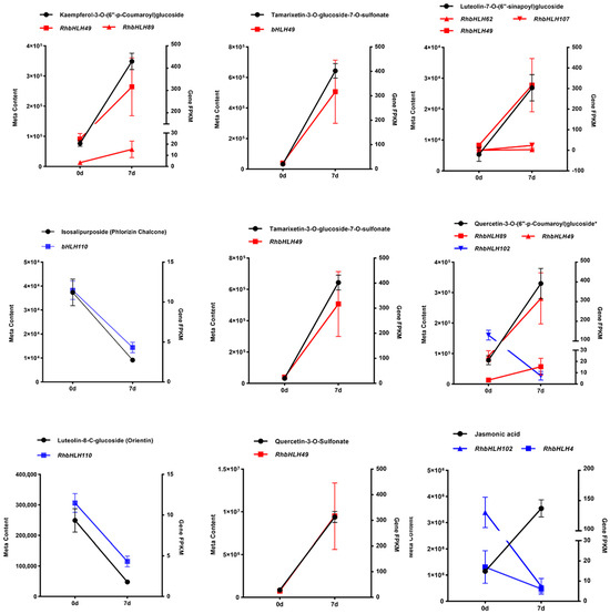 After heat treatment, Tamarixetin-3-O-glucoside-7-O-sulfonateexpression levels increased, and the expression levels of RhbHLH49 and RhbHLH89, which are positively correlated with it, also increased; jasmonic acid accumulation significantly increased after high-temperature treatment, while the negatively correlated RhbHLH102 and RhbHLH4 were downregulated (Figure 16). We performed the same analysis on the other flavonoids. The results indicated that 6 RhbHLH genes might be involved in regulating flavonoids and jasmonic acid in response to heat stress. Detailed data can be found in the Supplementary File S5.