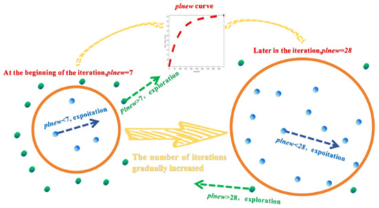 A parameter ranging in the interval [7, 28] and increasing nonlinearly with the number of iterations was designed. At the beginning of the iteration, the value was small, and most of the barnacle particles were outside the range of the value to fully explore the solution space. As the number of iterations increased, the value increased nonlinearly, and the algorithm gradually transitioned from the exploration phase to the exploitation phase. At the end of the iteration, the value reached approximately 28, at which time most particles were in the exploitation stage. However, a small number of barnacle particles still perform global exploration to find possible global optimal solutions. This design not only makes the exploration and exploitation process of the BMO algorithm well balanced and speeds up the algorithm’s convergence but also increases the adaptivity of the algorithm. The proposed optimization mechanism is illustrated in Figure 1.