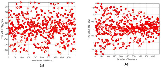 where t is the number of current iterations; T is the maximum number of iterations; is a random number in [−1, 1]; and R is a random number in the interval (0, 1). It can be seen from Figure 2a that fluctuates uniformly in the interval (−1, 1). The introduction of increases the variability of . From Figure 2b, the value of decreases gradually from the (−2, 2) interval to the (−1, 1) interval. Even at the end of the iteration, fluctuates in the (−1, 1) interval, which fully retains the diversity of the population and improves the exploitation ability of the algorithm. decreases linearly with the number of iterations in the (1, 2) interval, and it can be seen from the comparison of Figure 2a,b that the addition of not only improves the range of fluctuation of but also accelerates the convergence speed of the algorithm. The improved iteration formula is as follows: