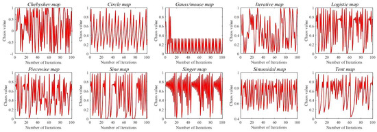 Figure 3 shows ten common chaotic mappings. The figure shows that the Chebyshev chaotic perturbation has good randomness with a perturbation range of [−1, 1], which is more significant than other chaotic perturbations and produces a wider global distribution of particles with more comprehensive information. Adding the perturbation at = 0.5 can maximize the retention of possible optimal solutions in the late iteration and increase the algorithm’s ability to jump out of the local optimal solution.