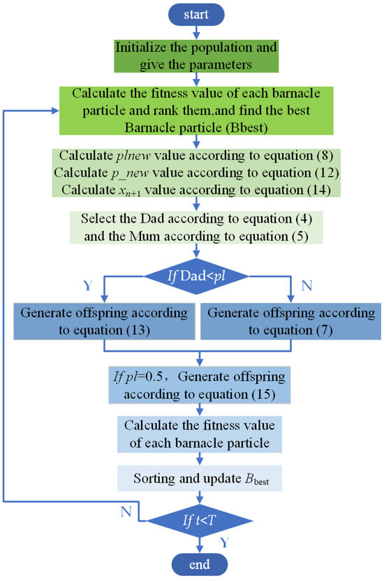 1. Randomly generate an initial population with a population size of N. Initialize the position of each barnacle particle using Equation (1) and set the parameters required for the execution of the algorithm: N, n, T, .