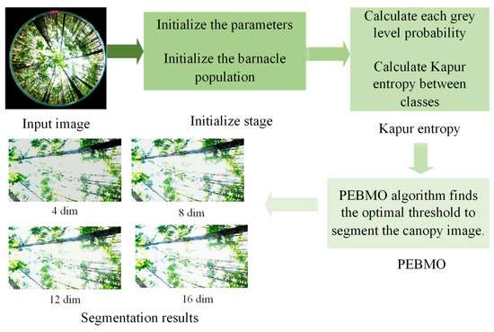 Image segmentation is the process of dividing the pixel points of the original image into different categories of sub-regions according to attributes such as color, texture, and intensity value, and then completing the process of extracting the target in the image [1]. Standard segmentation methods include the thresholding method [2,3,4,5], region technique [6], watershed algorithm [7], and deep learning [8,9,10]. The region-based segmentation method has a severe segmentation deficiency for aggregated particle adhesion [11]. The watershed algorithm has the disadvantage of over-segmentation and reflected light interfering with the image [12]. Deep learning is widely used in forest canopy image segmentation owing to its high segmentation accuracy, robustness, adaptability, and ability to handle large-scale data. U-Net, Mask R-CNN and Transformers are classical segmentation modules in deep learning. However, segmentation methods based on deep learning also suffer from high training cost. They are long and time-consuming, have limitations in being sensitive to noise, and are not suitable for segmenting small-sample images with little feature information and high randomness. Compared to the deep learning method, the threshold segmentation method utilizes the information in the image histogram to find the threshold value of the image. It distinguishes different target and background regions by setting multiple threshold values [13]. Since it relies on simple mathematical operations, it outperforms complex deep learning models in terms of processing speed. The key to threshold segmentation is selecting an appropriate segmentation method to determine the segmentation threshold. Threshold selection methods based on information entropy have attracted considerable attention owing to their clear mathematical concepts. Otsu entropy [14], Renyi entropy [15], and Kapur entropy [16] are typical information entropy methods. The Otsu method selects segmentation thresholds to maximize the variance between the target and background classes. It is suitable for the case where the area occupied by the target and the background in the image are close, and the Otsu segmentation method will be invalid when the area occupied by the two is disparate [17]. The essence of Renyi entropy is to use the subordination function to convert the image histogram information into a fuzzy domain and then obtain the optimal threshold value to segment the image based on the principle of maximum entropy [18]. The adjustable parameter is an essential parameter in Renyi entropy, and the value of determines the form of Renyi entropy. Although different segmentation effects can be obtained by adjusting , it is a challenge to select the optimal parameter reasonably. Improper selection may lead to over-segmentation or under-segmentation phenomenon. The segmentation principle of Kapur entropy is that the total entropy value of the target class and the background class is the maximum. Because Kapur entropy is based on the grey level intra-class probability when calculating the entropy value, it is not sensitive to the size of the divided target and background, can better retain small targets in the image [19], and is widely used in color image segmentation.