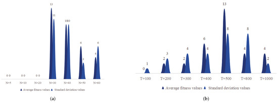 Histogram of the distribution of optimal values in the parameter sensitivity test. (a) Histogram of the distribution of the optimal average fitness values and standard deviation values for different values of N; (b) is a histogram of the distribution of optimal average fitness values and standard deviation values for different values of T.