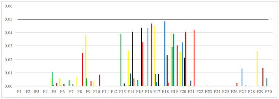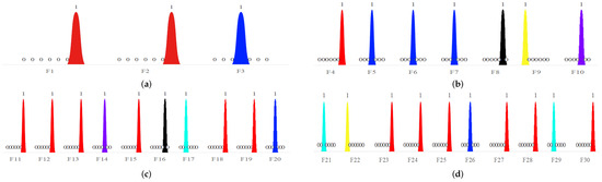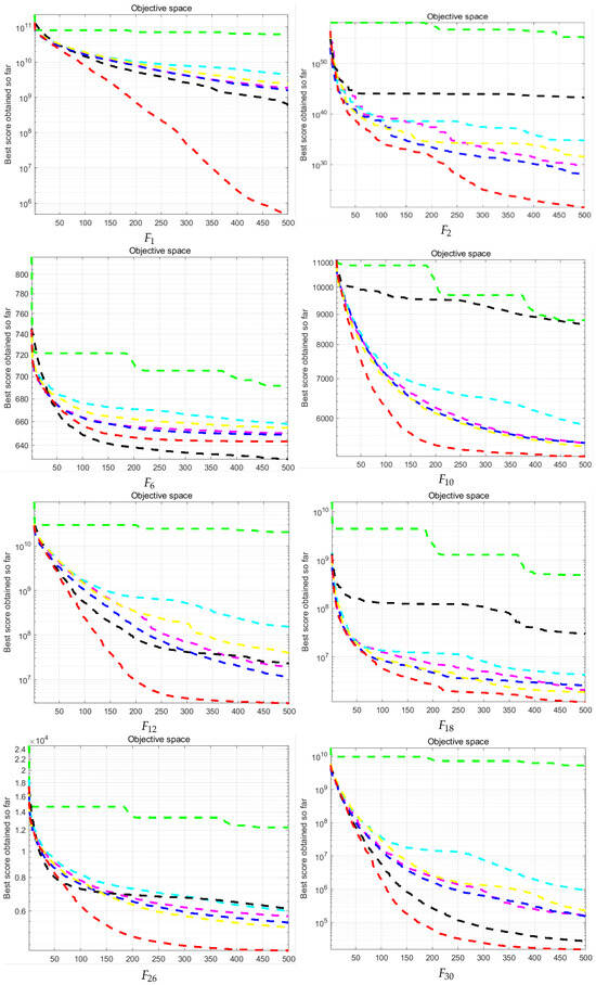 CEC2017 is a collection of test functions used in the 2017 IEEE Congress on Evolutionary Computation (CEC) competition, and the essential information is shown in Table 1. Among them, are single-peak functions containing only one global optimal solution, which are used to test the convergence speed and local search ability of the algorithm. shows unstable behavior, especially for higher dimensions, and significant performance variations for the same algorithm implemented. For high-dimensional test functions, is usually excluded. Since this study is not a high-dimensional testing study, however, is also tested. are multi-peak functions containing multiple local optimal solutions, which are used to test the exploration ability of the algorithms and the ability to jump out of the local optimal solutions. Such functions are adapted to test the performance of algorithms in solving complex multipeak optimization problems. are hybrid functions that contain multiple functions combined to create variety and complexity. are composite functions, which are combinations of various simple functions, each of which is univariate but combined to form a high-dimensional composite function. Hybrid and composite functions were used to solve large-scale optimization problems and test the potential of the algorithms to solve complex problems in the real world.