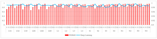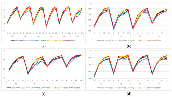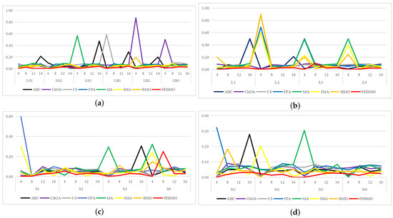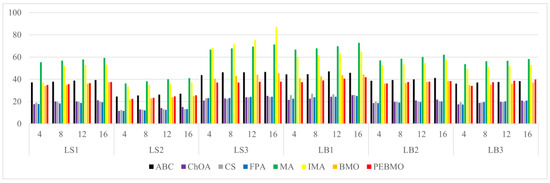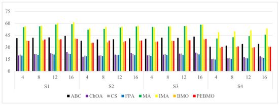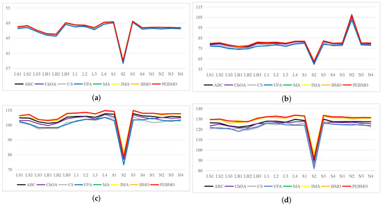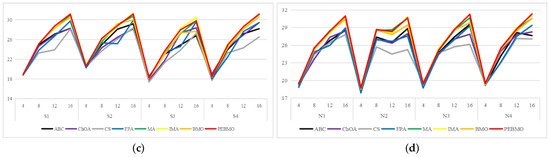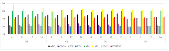 To summarize, the parameters N and T affect the evaluation of the algorithm’s performance. Too large and too small N and T are not conducive to the algorithm performance test. The experimental results show that the PEBMO algorithm obtains the most optimal fitness values and standard deviation values when N = 30, which is 43.33% and 36.67% better than other particle numbers, respectively. As for the number of iterations, the PEBMO algorithm obtained 43.33% of the optimal average fitness value and 26.67% of the optimal standard deviation value when T = 500, which is better than other T values. Therefore, in the algorithm performance testing experiments, the number of population particles is N = 30, and the number of iterations is chosen as T = 500.