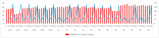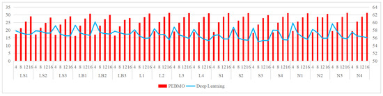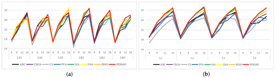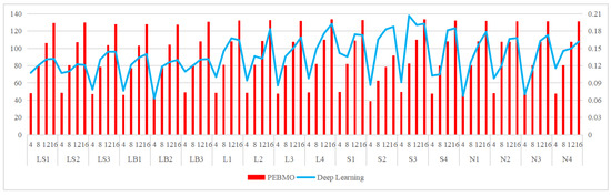 In order to objectively analyze the influence of the changes of parameters N and T on the accuracy and stability of the PEBMO algorithm’s optimization search, a sensitivity analysis is carried out. Table 1 is used as the test function, and the average adaptability and standard deviation values are the evaluation indices. The average fitness values reflect the optimization accuracy of the algorithm. The standard deviation reflects the stability of an algorithm. The optimization accuracy and stability of the PEBMO algorithm are verified at different N and T values, respectively. Figure 6a shows the number of the optimal average fitness values and standard deviation values obtained by the PEBMO algorithm at different values of N. The figure shows that the PEBMO algorithm obtains 13, 10, 6, and 4 optimal average fitness values and 11, 10, 3, and 6 optimal standard deviation values when N is 30, 40, 50, and 60, respectively. No optimal fitness values and standard deviation values were obtained for N of 5, 10 and 20. This is due to the fact that the algorithm cannot fully explore the solution space when N is small, and the computational complexity increases when N is large. Therefore, neither too large nor too small N is conducive to the algorithm’s optimization search. It is worth noting that there are three sets of juxtaposed optimal values in obtaining the average fitness value, thus leading to more than 30 total optimal averages. Figure 6b shows the number of the optimal average fitness values and standard deviation values obtained by the PEBMO algorithm at different values of T. From the figure, it can be seen that the effect on the average fitness values is more significant at different T values compared to the standard deviation values. Thirteen optimal average fitness values and eight optimal standard deviation values were obtained at T = 500, which are better than the other T values.