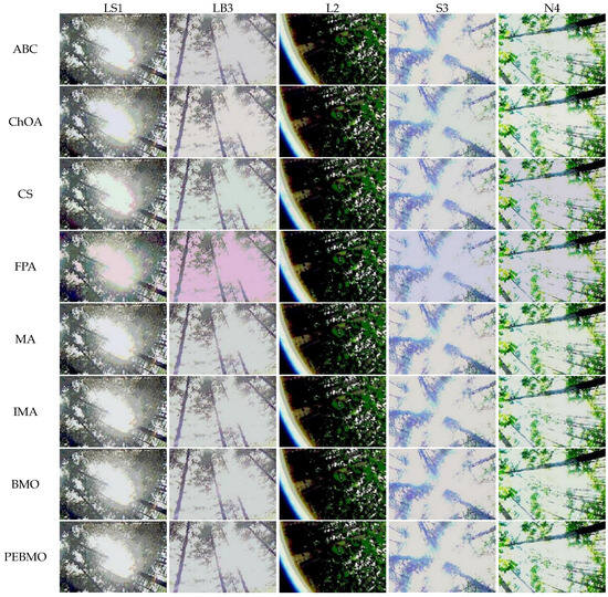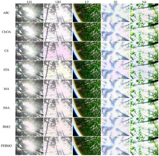 Forest canopy images have various complex backgrounds, and the gray levels vary widely, requiring multiple thresholds for accurate segmentation. Traditional image segmentation methods use enumeration, and when performing threshold segmentation, each combination must be individually tested to select the optimal threshold. The computational complexity increases exponentially with an increase in the number of thresholds. To overcome these limitations, scholars view finding the optimal thresholds in multithreshold segmentation as an optimization problem with constraints. Heuristic optimization algorithms search for optimal thresholds to reduce the computational complexity. Intelligent optimization algorithms, such as the Golden Jackal Optimization Algorithm [20], Elephant Herding Optimization Algorithm [21], Sand Cat Optimization Algorithm [22], and Dung Beetle Optimization Algorithm [23] have been successfully applied to image segmentation. Studies have shown that the performance of intelligent algorithms significantly affects the segmentation accuracy and efficiency of the images. Therefore, improving intelligent algorithms to enhance their performance and image segmentation accuracy and efficiency has become the focus of research. Sukanta Nama proposes a quasi-reflected slime mold (QRSMA) method combined with a quasi-reflective learning mechanism. The results of the CEC2020 benchmark function tests showed that QRSMA outperformed the statistical, convergence, and diversity measures of the slime mold algorithm. It also outperformed other existing methods for segmenting COVID-19 X-ray images [24]. Jiquan Wang et al. proposed a Whale Optimization Algorithm combining mutation and de-similarity to address the limitations of the whale optimization Algorithm easily falling into local optimal solutions. Multilevel threshold segmentation was performed on ten grayscale images using Kapur and Otsu as the objective function. The experimental results showed that CRWOA outperformed the five compared algorithms in terms of convergence and segmentation quality [25]. Essam H. Houssein et al. proposed a chimpanzee optimization algorithm (IChOA) based on the strategy of contrastive learning and Levy Flight improvement. IChOA was tested on a dataset from the database of infrared images using Otsu and Kapur methods. The experimental results show that the IChOA is robust for segmenting various positive and negative cases [26]. Laith Abualigah et al. proposed a novel hybrid algorithm (MPASSA) to determine the optimal thresholds in multi-threshold segmentation by borrowing the properties of the Marine Predator and Salp Swarm Algorithm. Multiple benchmark images were used to verify the performance of the MPASSA. The experimental results show that MPASSA avoids the problem of falling into the local optima. It also has a strong solution capability for image-segmentation problems [27].
