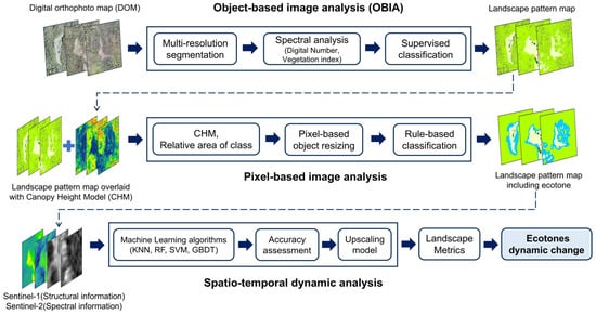 The workflow of this study (Figure 1) can be summarized into five main stages: (i) acquisition of UAV data; (ii) pre-processing of UAV orthophotos and LiDAR data to generate the visible light images and the canopy height model along with derived products; (iii) classification of the imagery to create fine-scale ecotone map; (iv) construction of ecotone upscaling model based on machine learning algorithms; and (v) spatiotemporal dynamic analysis incorporating detection of ecotones at large scale in different periods and landscape fragmentation assessment using landscape metrics.