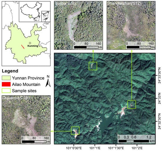 This study was conducted in the Ailao Mountain area in central Yunnan Province, China. The region is at the crossroads of three important natural geographic zones, namely the Yunnan-Guizhou Plateau, the Hengduan Mountains, and the Qinghai-Tibet Plateau, where a diverse range of biota converge from east to west and north to south, resulting in high biodiversity and making it a very relevant zone for ecological research [28]. Within this biodiversity hotspot, the specific study area (Figure 2) is located in the Xujiaba area (24°32′ N, 101°01′ E) in the Ailao Mountain National Nature Reserve, with an altitude of 2400–2600 m [29]. The study area belongs to the southwest monsoon region, with distinct dry (November to April) and rainy seasons (May to October), the average annual temperature in this area is 11.3 °C, and the average annual precipitation is 1931 mm. The reserve is characterized by large areas of continuous subtropical broad-leaved evergreen forests, and the tree layer is dominated by Lithocarpus hancei, Lithocarpus xylocarpus, Schima noronhae, Hartia sinensis, Camellia forrestii, Manglietia insignis, Michelia floribunda, etc. [30]. In this study, three types of forest-grassland ecotones, named Bojiba (BJB), Dujuanba (DJB), and Shengtaizhan (STZ) were investigated, each with an area of 0.16 km2 and a total area of 0.48 km2. These plots represent post-cultivation, naturally formed, and cultivation-influenced ecotones, respectively. Each plot features a central grassland area encircled by forests, which simplifies feature identification from UAV orthophotos and satellite data, especially in mountainous areas with complex terrain.
