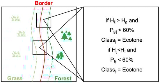 The ecotones between forest and grassland refer to mixed vegetation above the grass layer but below the overstory formed by a combination of side branches of canopy trees, small trees, and shrubs [1]. Based on this, variations in height served as indicators of the environmental gradient along the forest-grassland boundary [23,34]. The first step to extract ecotones between forest and grassland is mapping the land-cover map for three sample plots. In our case, we chose object-based image classification (OBIC) in the eCognition developer 10.3 to distinguish forest, grass, shadow, and other classes (farmland, road, etc.) based on UAV orthoimages. Then, we adopted the method developed by Hou and Walz [34], which can be concluded as a “shrinking process” to detect the ecotones. There were two prerequisites used for extracting the ecotones: vegetation height and proportion of non-ecotone pixels. By overlaying the land-cover map with the Canopy Height Model (DSM-DTM), the average height of forest (Hf) and grassland (Hg) in each sample site was calculated using the “zonal statistics” tool in ArcGIS 10.7. In addition to the height limits, the proportion of non-ecotone pixels within the moving window was set to less than 60% based on the model from Riitters et al. [35]. To minimize the impact of shadows, this class was reclassified to forest or grassland based on the proportion of classes in the nearest pixel before running the shrinking procedure. The shrinking process was completed in eCognition developer 10.3 using the “pixel-base object resizing” tool. A window moving along the edge between forest and grassland was used to judge pixels under two conditions (height restriction and area ratio), the specific processes (Figure 3) were (1) shrink forest along the border pixels where CHM < Hf and the proportion of forest pixels within a moving window (201 by 201 pixels, which is c. 0.01 km2) < 60% and (2) shrink grassland along the border pixels where CHM > Hg and the proportion of grassland pixels within a moving window (201 by 201 pixels) < 60%. Finally, impurities inside the ecotones were eliminated by removing forest/grassland pixels smaller than four pixels and enclosing by ecotones to avoid some mixed pixels. Following the processing sequence described above, we produced ecotone-containing land-cover maps to serve as training examples for the subsequent ecotone-upscaling models.